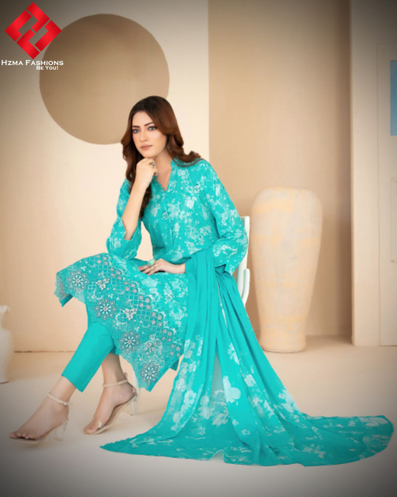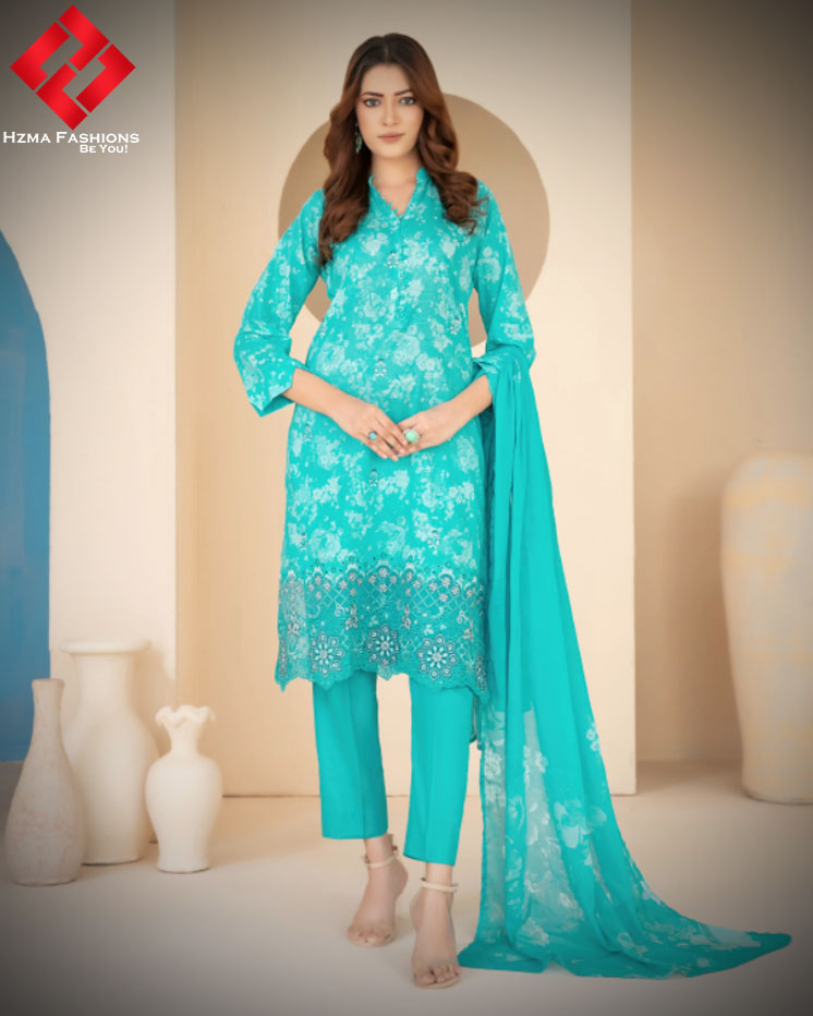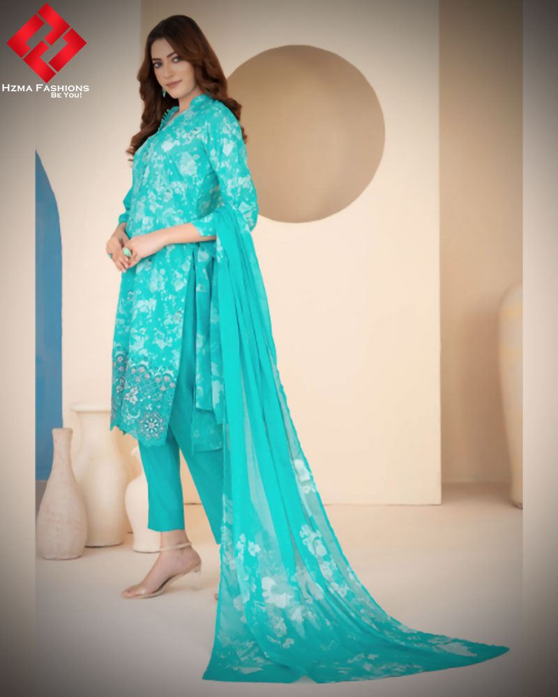 Additionally, the exclusive digital printed lawn dupatta adds sophistication. The light, breathable fabric provides ease while keeping the attire stylish. With its artistic digital prints, the dupatta perfectly complements the embroidered shirt. Therefore, the entire outfit appears coordinated and balanced.