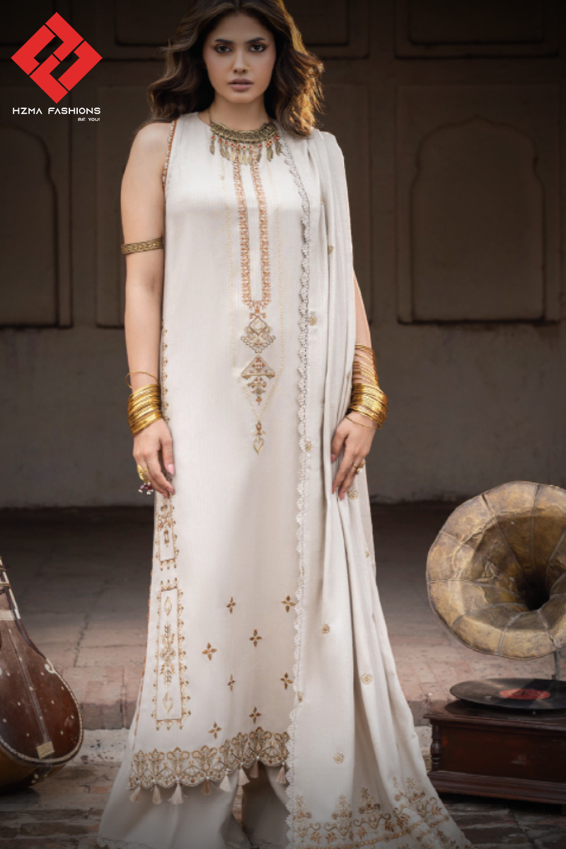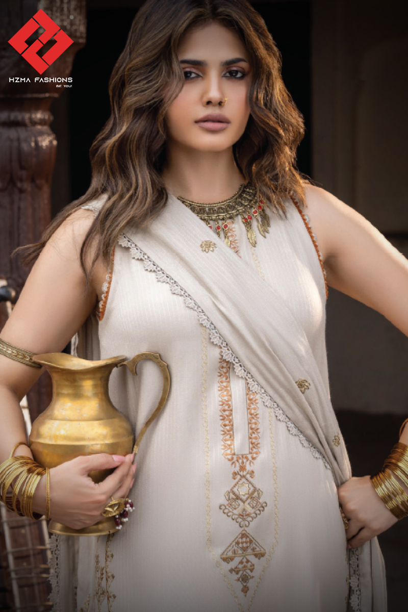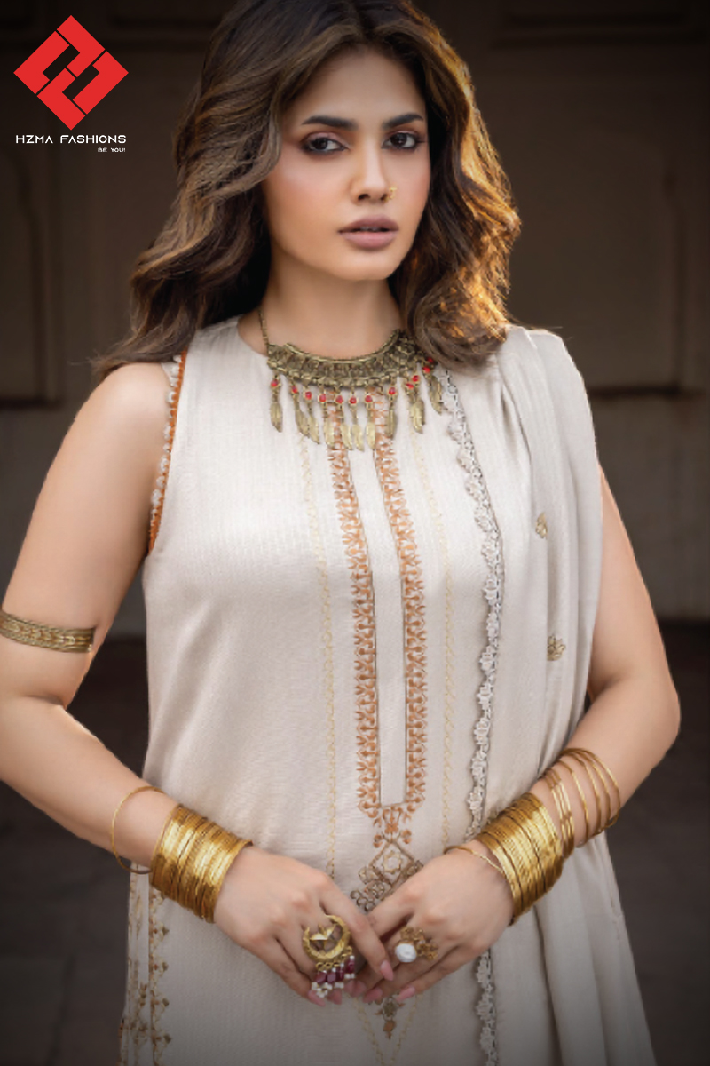 Discover timeless elegance with Mehrmah by Celts, a luxurious three-piece Embroidered Tiktok Leather Peach Collection. The outfit includes an embroidered shirt with detailed sleeves, a soft woolen embroidered shawl, and a dyed trouser for a refined finish. Crafted from premium fabric, it offers comfort, durability, and graceful drape. Moreover, its delicate embroidery and warm tones make it perfect for festive occasions or formal gatherings. Because of its versatile design, it beautifully blends tradition with modern style. Step into sophistication and charm with Mehrmah by Celts, where elegance meets effortless comfort.