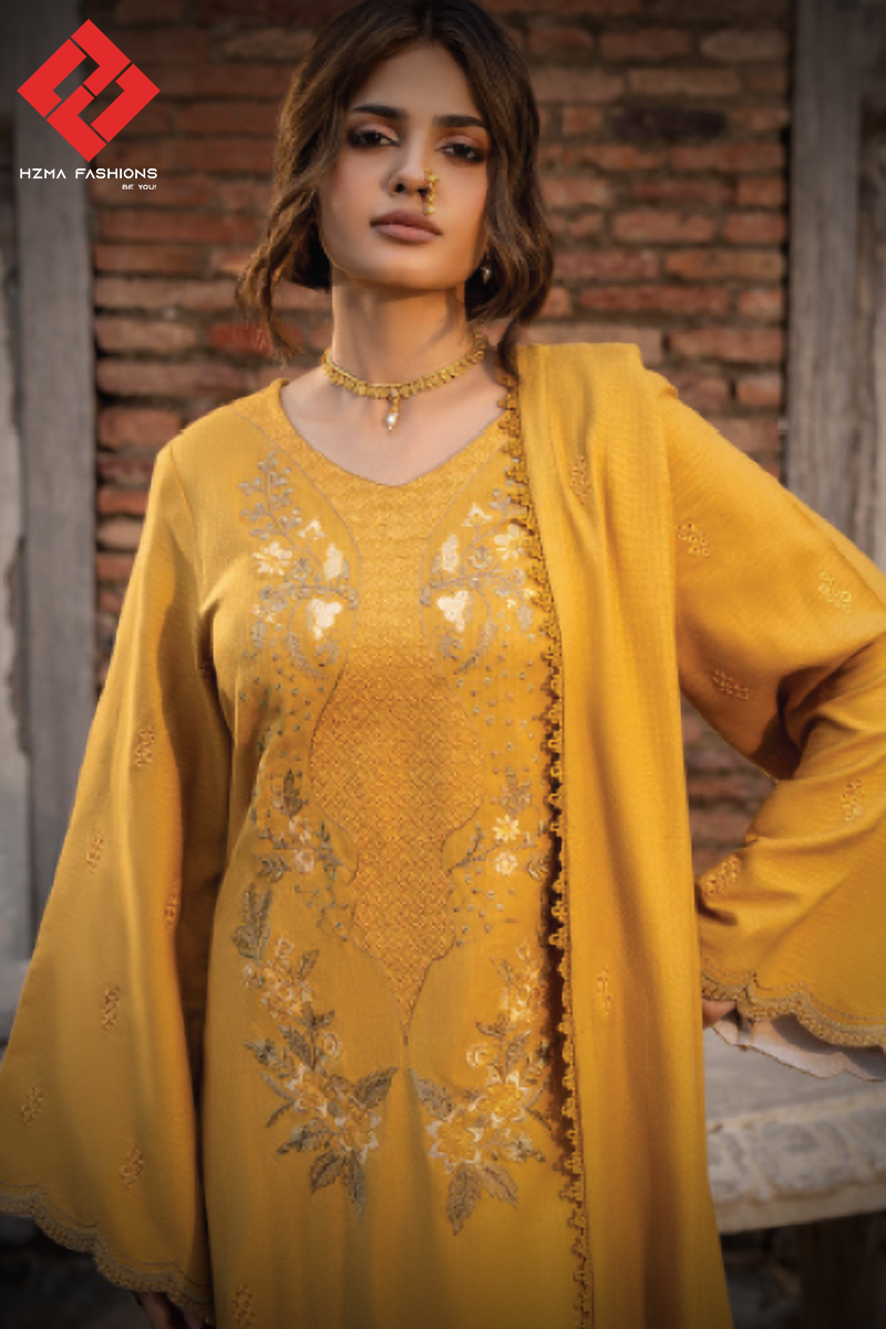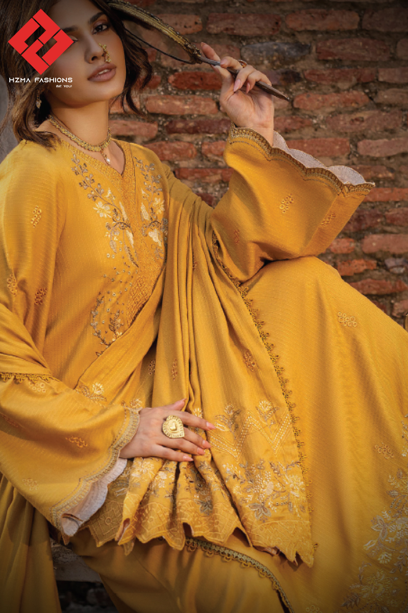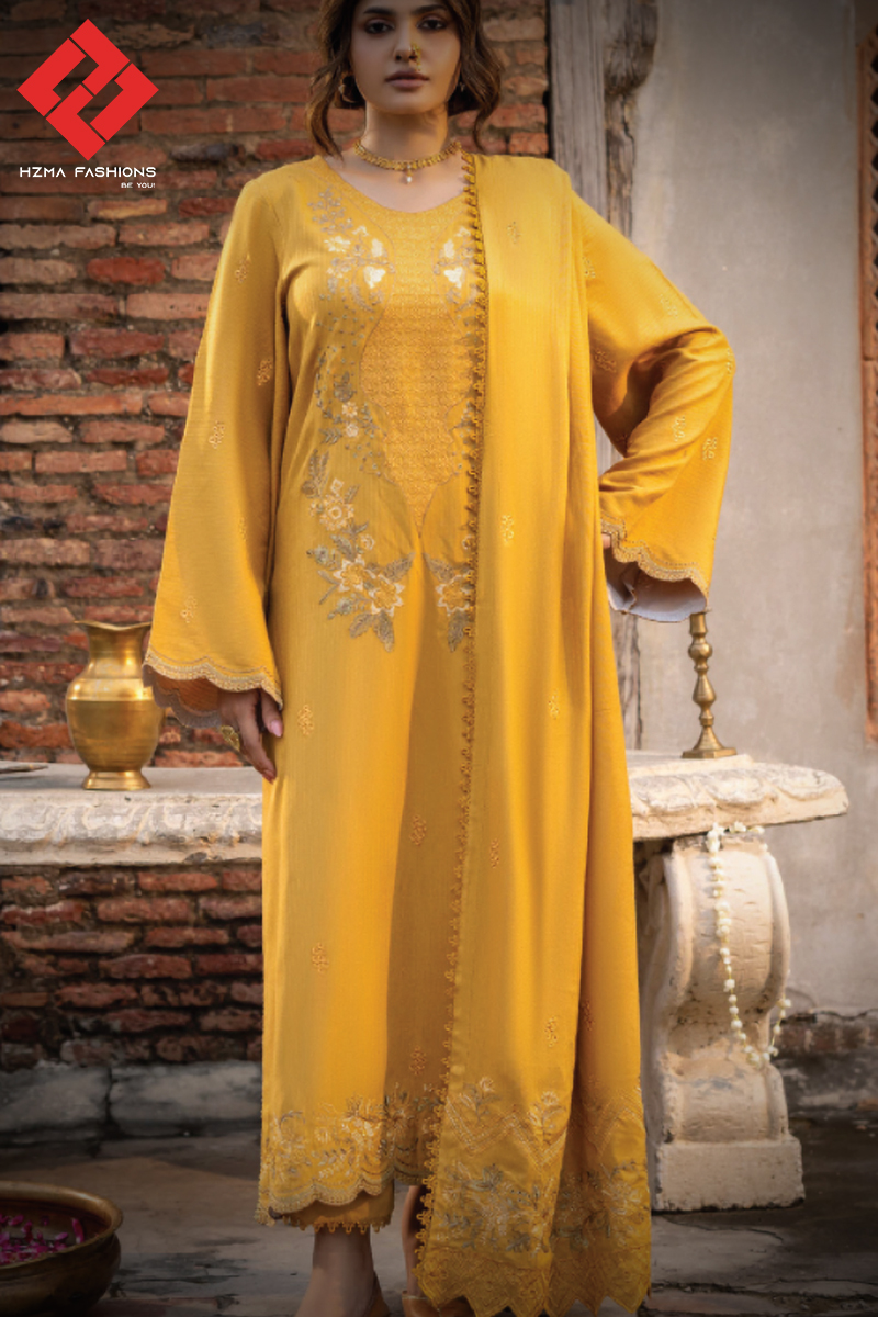 Discover timeless elegance with Mehrmah by Celts, a luxurious three-piece Embroidered Tiktok Leather Peach Collection. The outfit includes an embroidered shirt with detailed sleeves, a soft woolen embroidered shawl, and a dyed trouser for a refined finish. Crafted from premium fabric, it offers comfort, durability, and graceful drape. Moreover, its delicate embroidery and warm tones make it perfect for festive occasions or formal gatherings. Because of its versatile design, it beautifully blends tradition with modern style. Step into sophistication and charm with Mehrmah by Celts, where elegance meets effortless comfort.